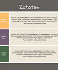 1x Tomate-Basilikum Zutaten: Tomatenmark* 22%, Wasser, Erdnusskerne* 15%, Cashewkerne* 13%, Branntweinessig**, Senfsaat*, Sonnenblumenöl*, Steinsalz, Basilikum*, Verdickungsmittel (Agar-Agar*, Guarkernmehl*)